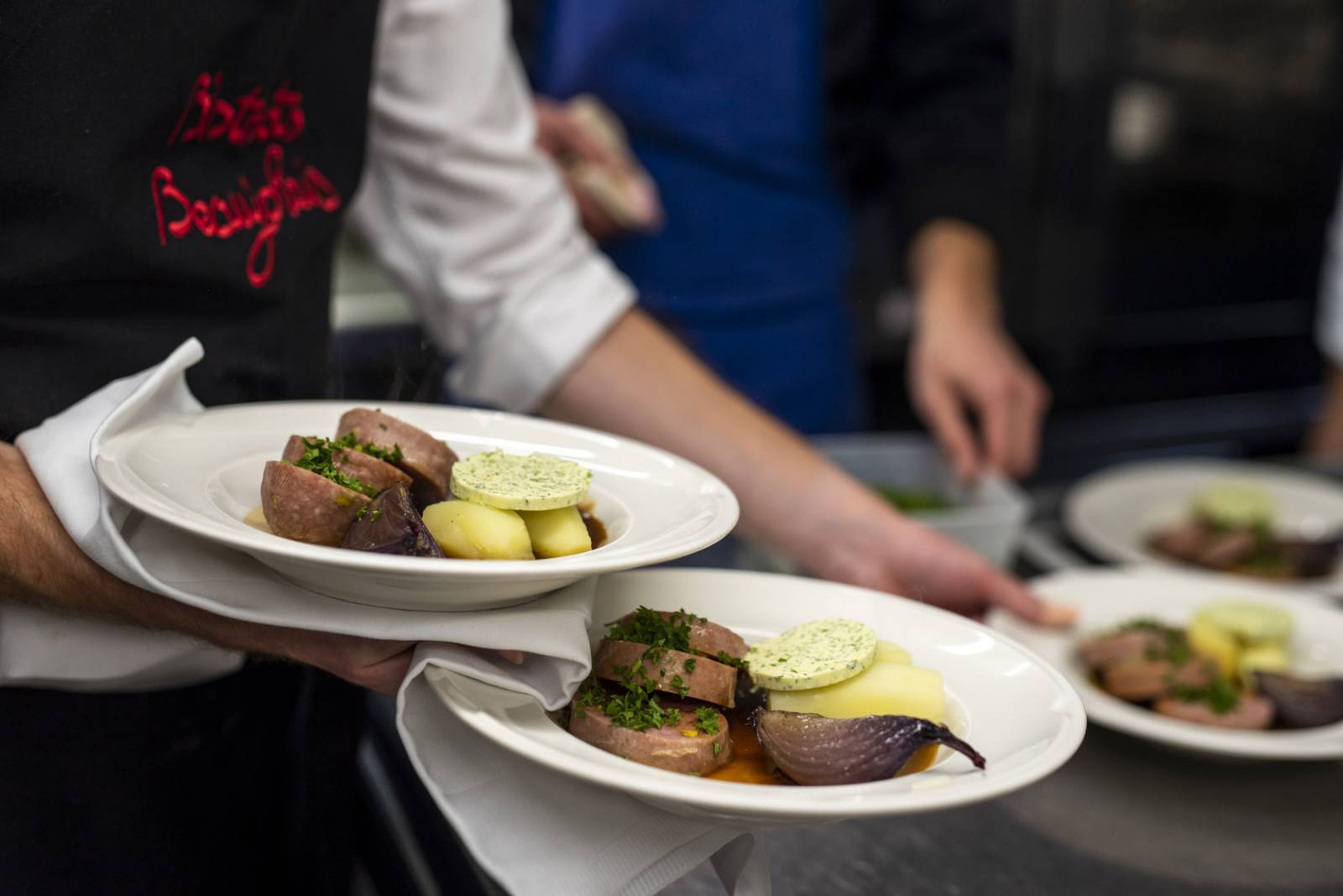 Saucisson pistaché, pommes vapeur, beurre maître d’hôtel et sauce vin rouge
